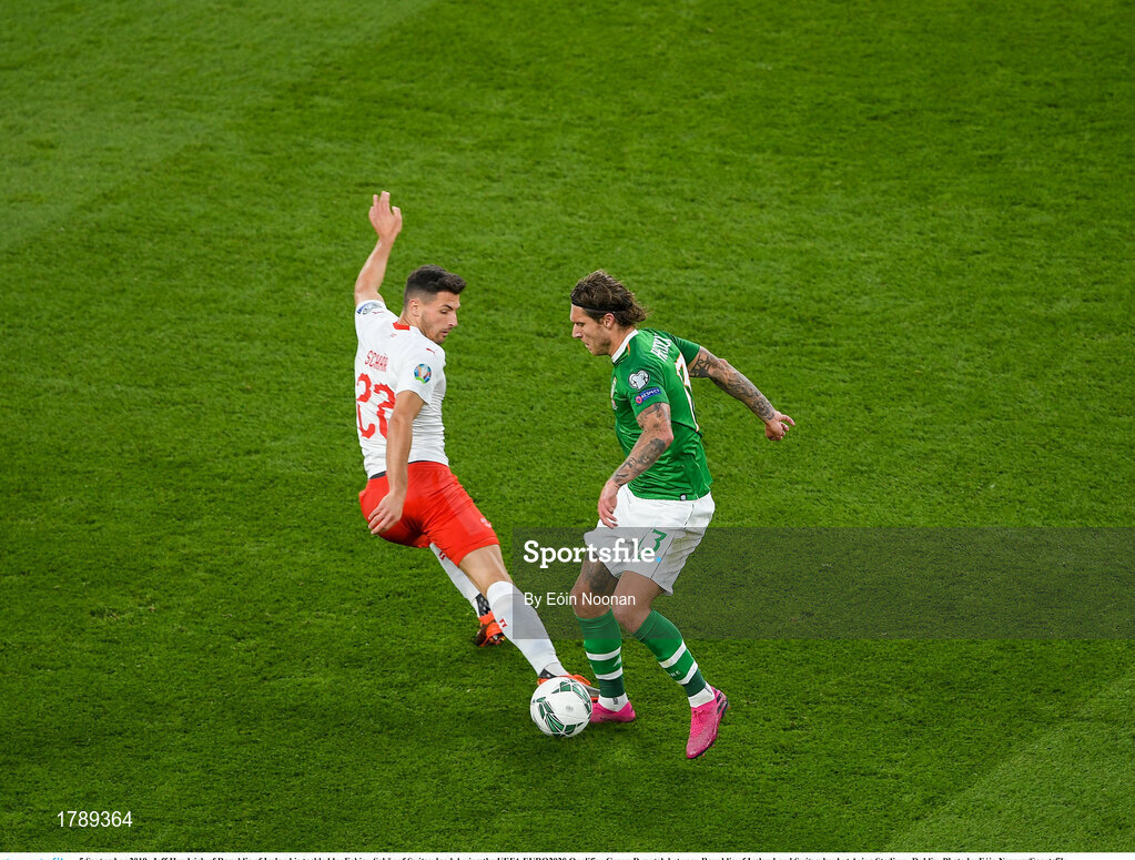 5 September 2019; Jeff Hendrick of Republic of Ireland is tackled by Fabian Schär of Switzerland during the UEFA EURO2020 Qualifier Group D match between Republic of Ireland and Switzerland at Aviva Stadium, Dublin. Photo by Eóin Noonan/Sportsfile