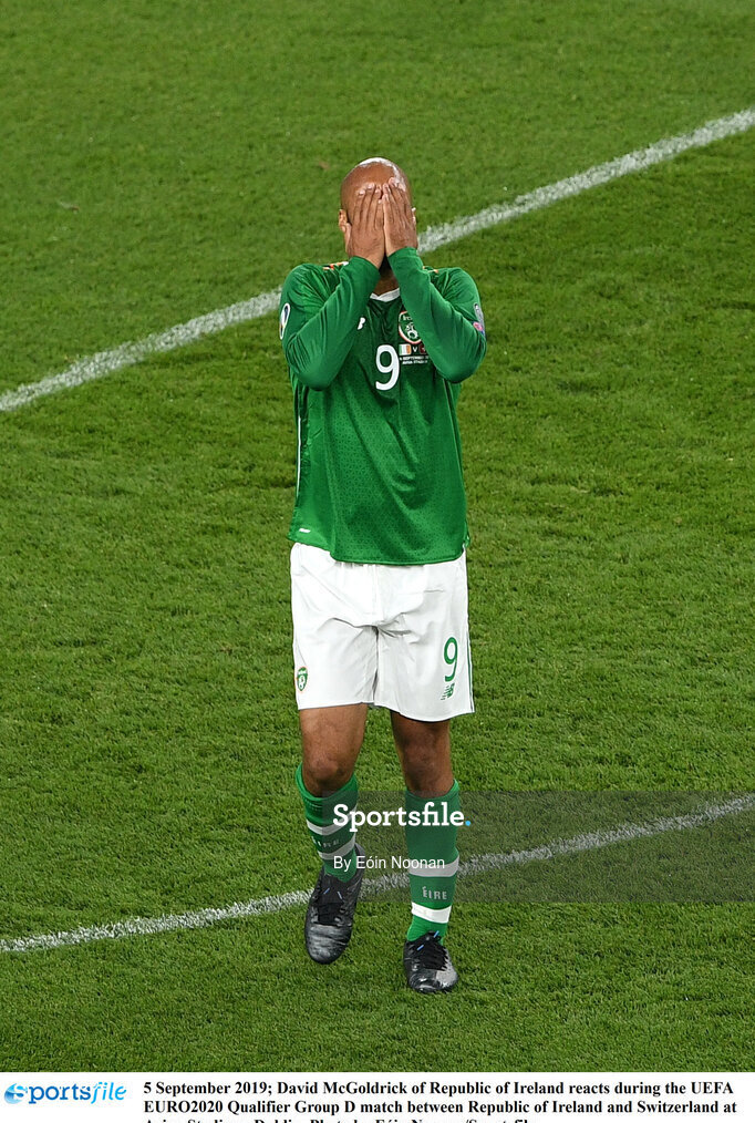 5 September 2019; David McGoldrick of Republic of Ireland reacts during the UEFA EURO2020 Qualifier Group D match between Republic of Ireland and Switzerland at Aviva Stadium, Dublin. Photo by Eóin Noonan/Sportsfile
