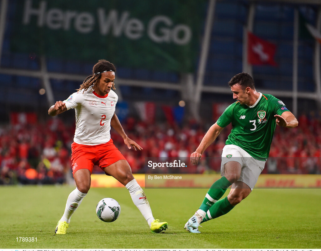5 September 2019; Michael Lang of Switzerland in action against Enda Stevens of Republic of Ireland during the UEFA EURO2020 Qualifier Group D match between Republic of Ireland and Switzerland at Aviva Stadium, Dublin. Photo by Ben McShane/Sportsfile