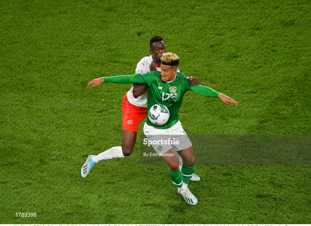 5 September 2019; Callum Robinson of Republic of Ireland in action against Renato Steffen of Switzerland during the UEFA EURO2020 Qualifier Group D match between Republic of Ireland and Switzerland at Aviva Stadium, Dublin. Photo by Eóin Noonan/Sportsfile