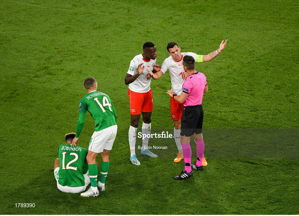 5 September 2019; Granit Xhaka of Switzerland, right, and Renato Steffen of Switzerland protest to referee Carlos del Cerro Grande during the UEFA EURO2020 Qualifier Group D match between Republic of Ireland and Switzerland at Aviva Stadium, Dublin. Photo by Eóin Noonan/Sportsfile