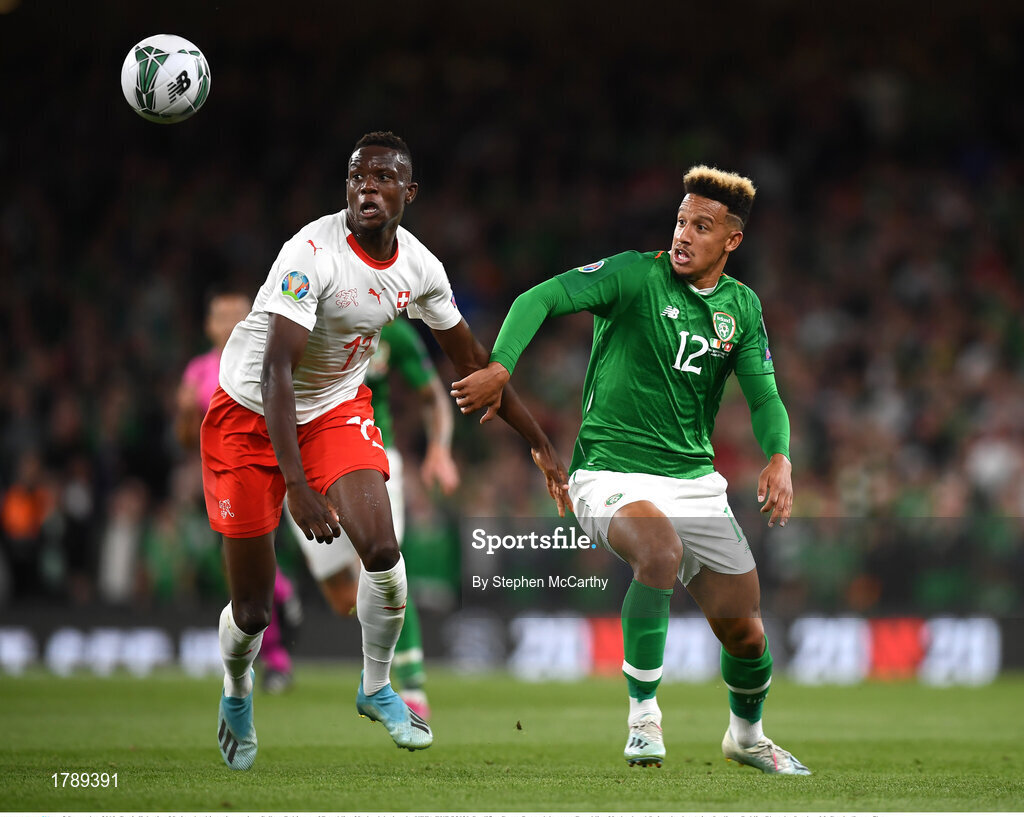 5 September 2019; Denis Zakaria of Switzerland in action against Callum Robinson of Republic of Ireland during the UEFA EURO2020 Qualifier Group D match between Republic of Ireland and Switzerland at Aviva Stadium, Dublin. Photo by Stephen McCarthy/Sportsfile