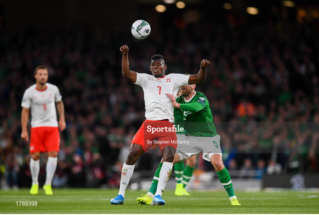 5 September 2019; Breel Embolo of Switzerland in action against Richard Keogh of Republic of Ireland during the UEFA EURO2020 Qualifier Group D match between Republic of Ireland and Switzerland at Aviva Stadium, Dublin. Photo by Stephen McCarthy/Sportsfile