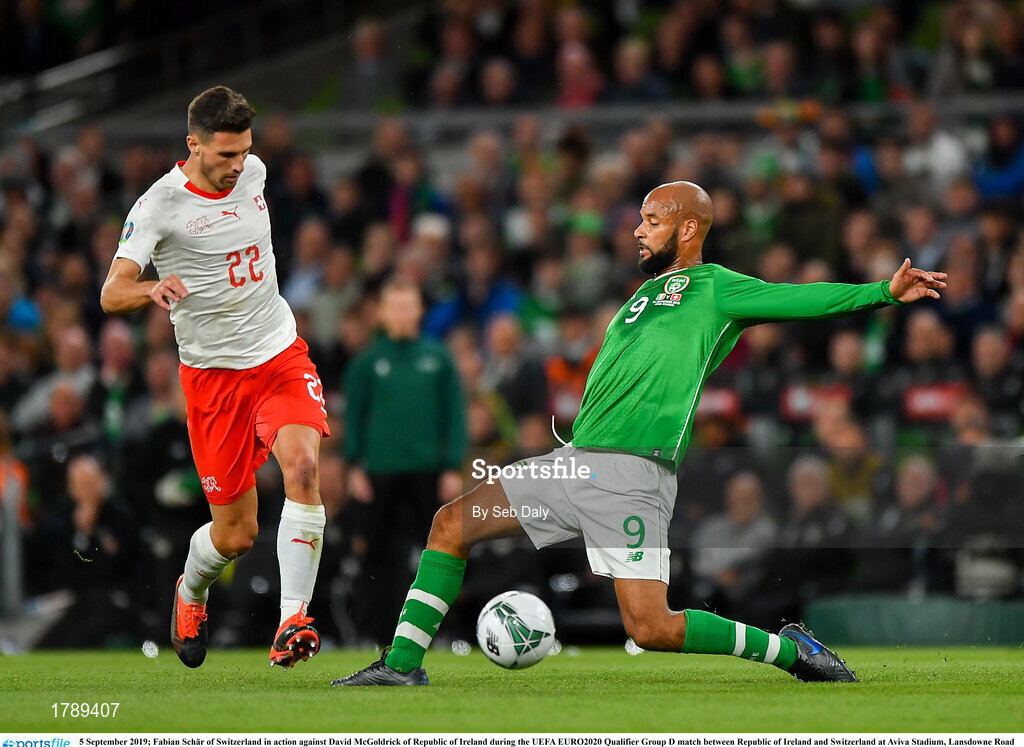 5 September 2019; Fabian Schär of Switzerland in action against David McGoldrick of Republic of Ireland during the UEFA EURO2020 Qualifier Group D match between Republic of Ireland and Switzerland at Aviva Stadium, Lansdowne Road in Dublin. Photo by Seb Daly/Sportsfile