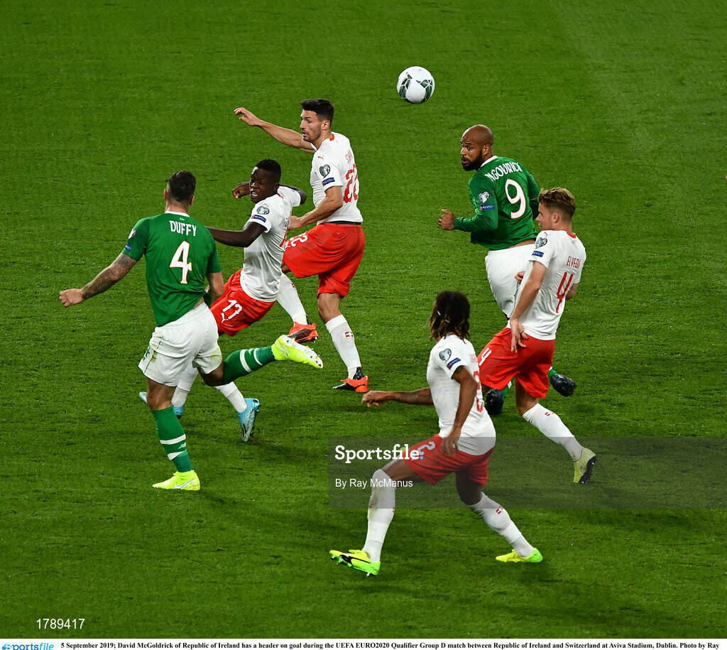 5 September 2019; David McGoldrick of Republic of Ireland has a header on goal during the UEFA EURO2020 Qualifier Group D match between Republic of Ireland and Switzerland at Aviva Stadium, Dublin. Photo by Ray McManus/Sportsfile