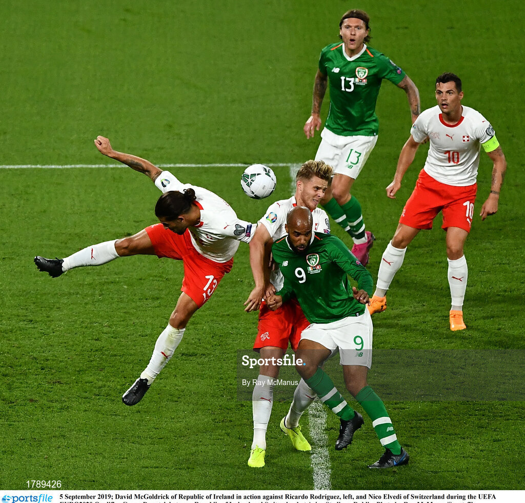 5 September 2019; David McGoldrick of Republic of Ireland in action against Ricardo Rodríguez, left, and Nico Elvedi of Switzerland during the UEFA EURO2020 Qualifier Group D match between Republic of Ireland and Switzerland at Aviva Stadium, Dublin. Photo by Ray McManus/Sportsfile
