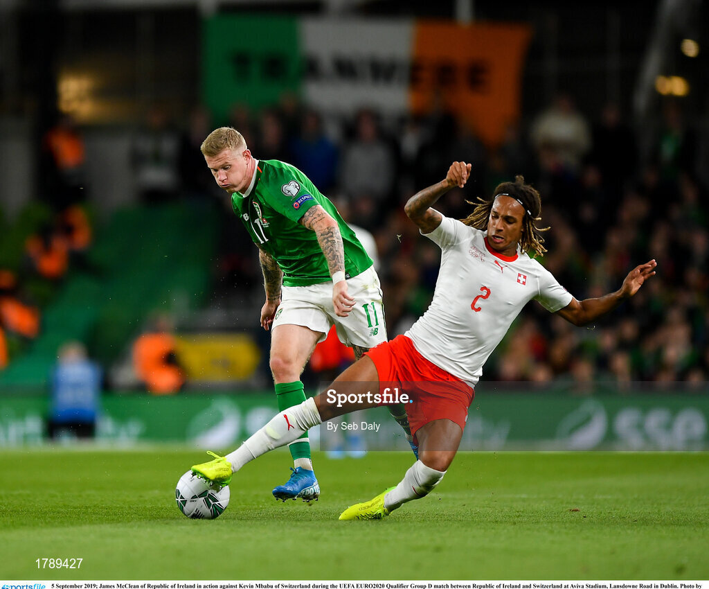 5 September 2019; James McClean of Republic of Ireland in action against Kevin Mbabu of Switzerland during the UEFA EURO2020 Qualifier Group D match between Republic of Ireland and Switzerland at Aviva Stadium, Lansdowne Road in Dublin. Photo by Seb Daly/Sportsfile