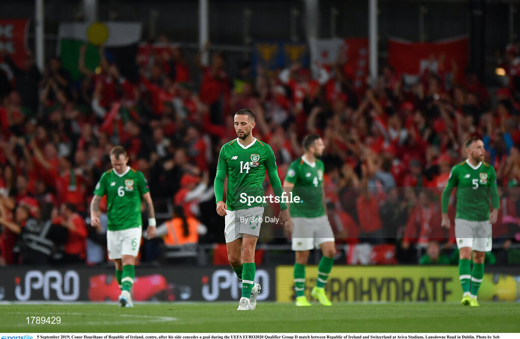 5 September 2019; Conor Hourihane of Republic of Ireland, centre, after his side concedes a goal during the UEFA EURO2020 Qualifier Group D match between Republic of Ireland and Switzerland at Aviva Stadium, Lansdowne Road in Dublin. Photo by Seb Daly/Sportsfile