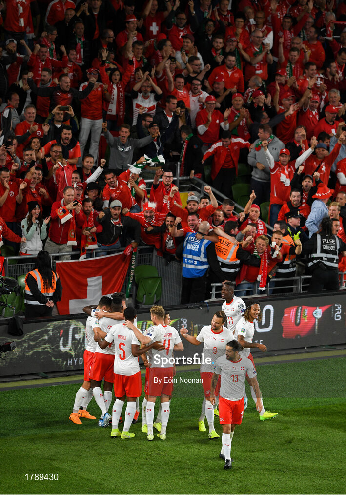 5 September 2019; Fabian Schär of Switzerland celebrates with team-mates after scoring his side's first goal during the UEFA EURO2020 Qualifier Group D match between Republic of Ireland and Switzerland at Aviva Stadium, Dublin. Photo by Eóin Noonan/Sportsfile