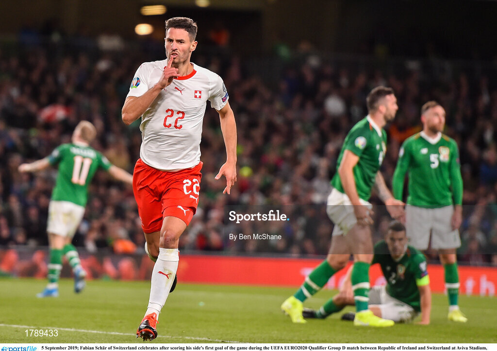 5 September 2019; Fabian Schär of Switzerland celebrates after scoring his side's first goal of the game during the UEFA EURO2020 Qualifier Group D match between Republic of Ireland and Switzerland at Aviva Stadium, Lansdowne Road in Dublin. Photo by Ben McShane/Sportsfile