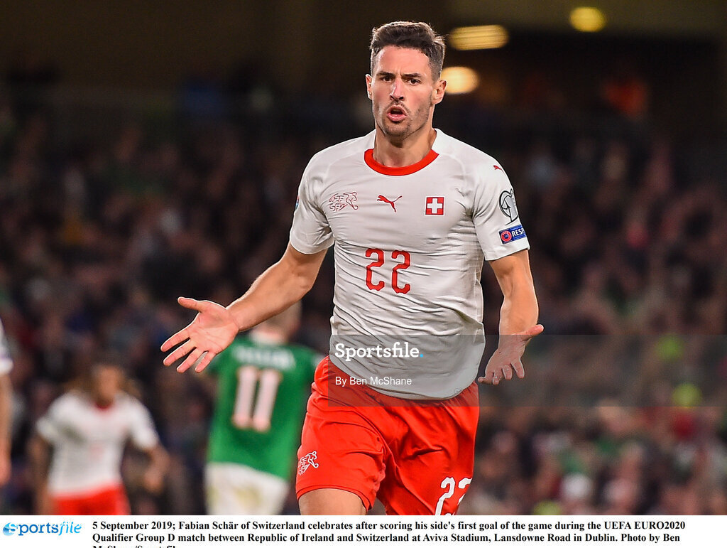5 September 2019; Fabian Schär of Switzerland celebrates after scoring his side's first goal of the game during the UEFA EURO2020 Qualifier Group D match between Republic of Ireland and Switzerland at Aviva Stadium, Lansdowne Road in Dublin. Photo by Ben McShane/Sportsfile