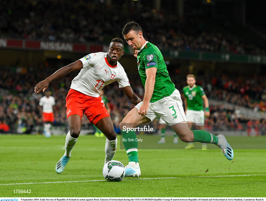 5 September 2019; Enda Stevens of Republic of Ireland in action against Denis Zakaria of Switzerland during the UEFA EURO2020 Qualifier Group D match between Republic of Ireland and Switzerland at Aviva Stadium, Lansdowne Road in Dublin. Photo by Seb Daly/Sportsfile