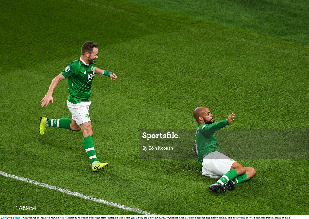 5 September 2019; David McGoldrick of Republic of Ireland celebrates after scoring his side's first goal during the UEFA EURO2020 Qualifier Group D match between Republic of Ireland and Switzerland at Aviva Stadium, Dublin. Photo by Eóin Noonan/Sportsfile