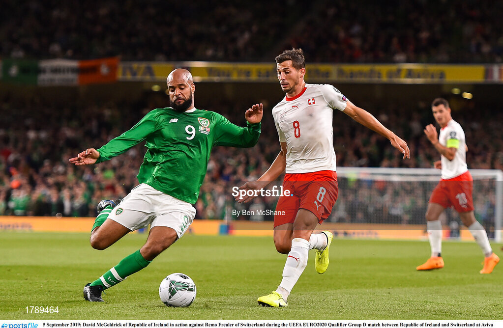 5 September 2019; David McGoldrick of Republic of Ireland in action against Remo Freuler of Switzerland during the UEFA EURO2020 Qualifier Group D match between Republic of Ireland and Switzerland at Aviva Stadium, Lansdowne Road in Dublin. Photo by Ben McShane/Sportsfile