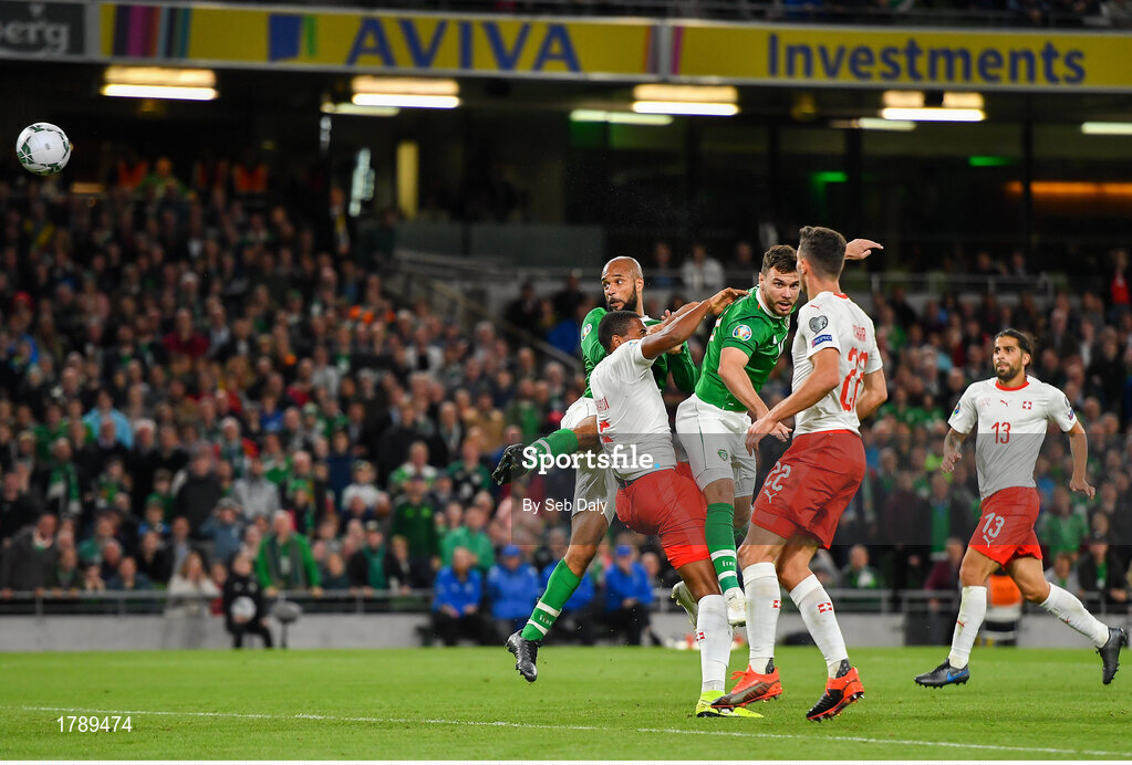 5 September 2019; David McGoldrick of Republic of Ireland, left, heads to score his side's first goal of the game during the UEFA EURO2020 Qualifier Group D match between Republic of Ireland and Switzerland at Aviva Stadium, Lansdowne Road in Dublin. Photo by Seb Daly/Sportsfile