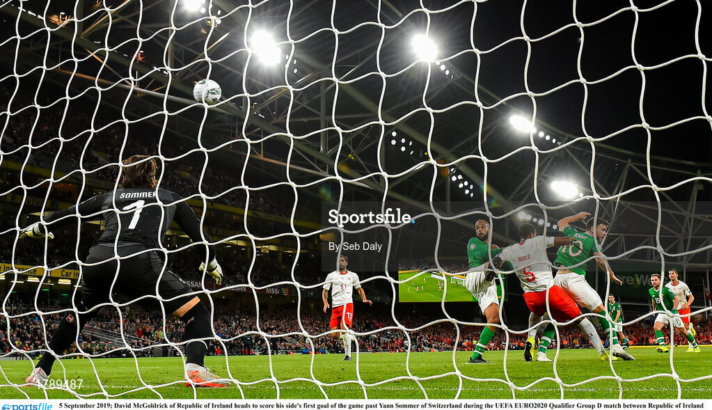 5 September 2019; David McGoldrick of Republic of Ireland heads to score his side's first goal of the game past Yann Sommer of Switzerland during the UEFA EURO2020 Qualifier Group D match between Republic of Ireland and Switzerland at Aviva Stadium, Lansdowne Road in Dublin. Photo by Seb Daly/Sportsfile