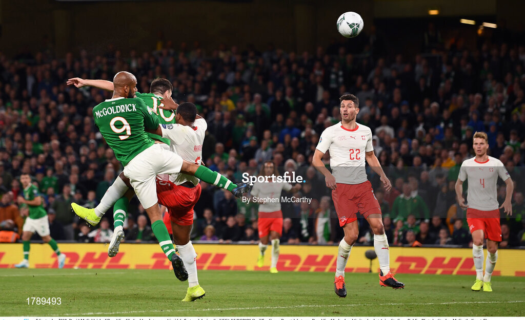 5 September 2019; David McGoldrick of Republic of Ireland heads to score his side's first goal during the UEFA EURO2020 Qualifier Group D match between Republic of Ireland and Switzerland at Aviva Stadium, Dublin. Photo by Stephen McCarthy/Sportsfile