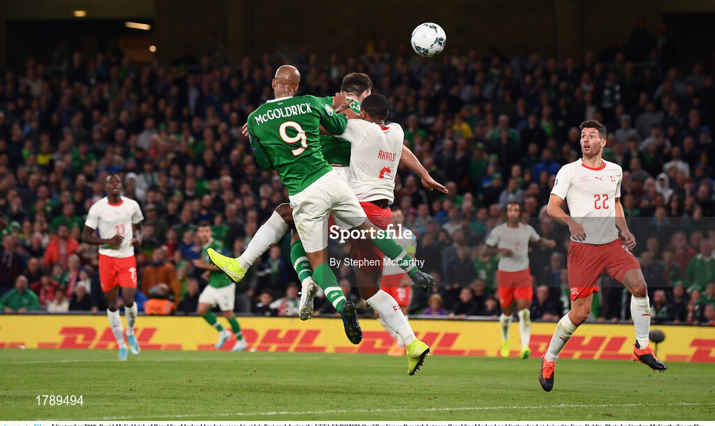 5 September 2019; David McGoldrick of Republic of Ireland heads to score his side's first goal during the UEFA EURO2020 Qualifier Group D match between Republic of Ireland and Switzerland at Aviva Stadium, Dublin. Photo by Stephen McCarthy/Sportsfile
