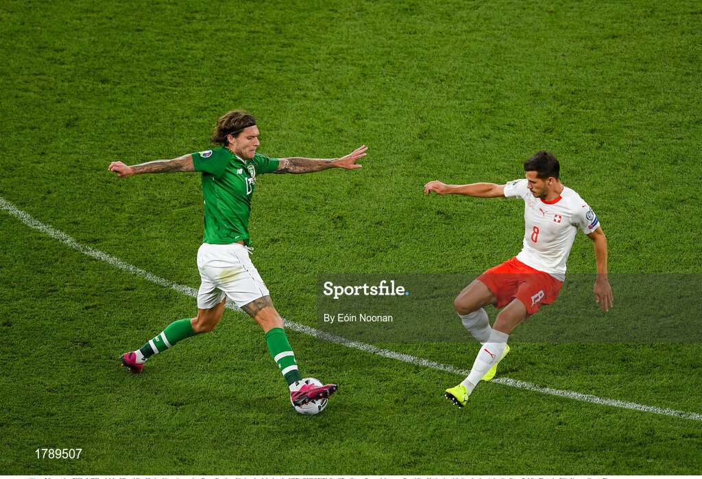 5 September 2019; Jeff Hendrick of Republic of Ireland in action against Remo Freuler of Switzerland during the UEFA EURO2020 Qualifier Group D match between Republic of Ireland and Switzerland at Aviva Stadium, Dublin. Photo by Eóin Noonan/Sportsfile