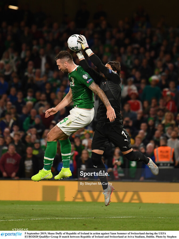 5 September 2019; Shane Duffy of Republic of Ireland in action against Yann Sommer of Switzerland during the UEFA EURO2020 Qualifier Group D match between Republic of Ireland and Switzerland at Aviva Stadium, Dublin. Photo by Stephen McCarthy/Sportsfile