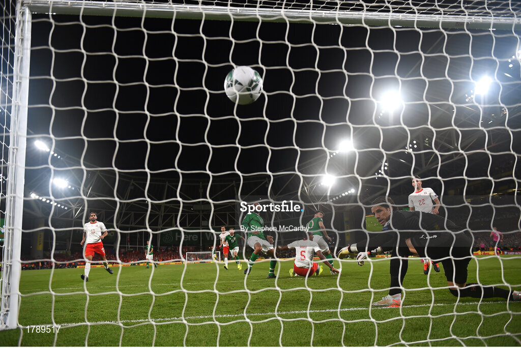 5 September 2019; David McGoldrick of Republic of Ireland heads to score his side's first goal of the game past Yann Sommer of Switzerland during the UEFA EURO2020 Qualifier Group D match between Republic of Ireland and Switzerland at Aviva Stadium, Lansdowne Road in Dublin. Photo by Stephen McCarthy/Sportsfile