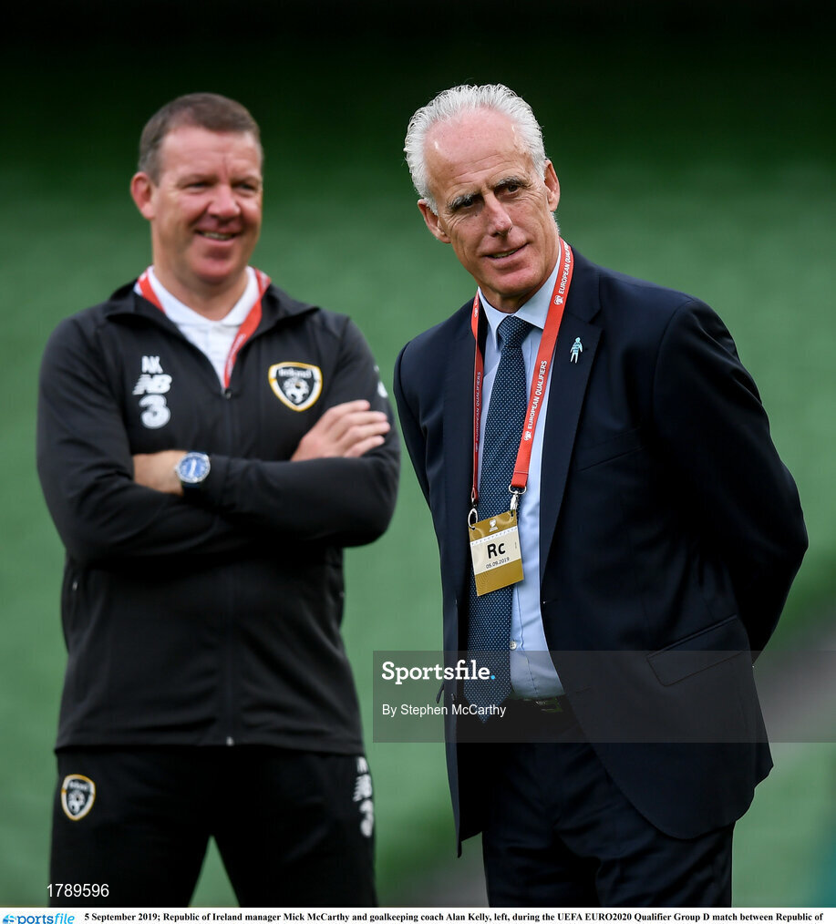 5 September 2019; Republic of Ireland manager Mick McCarthy and goalkeeping coach Alan Kelly, left, during the UEFA EURO2020 Qualifier Group D match between Republic of Ireland and Switzerland at Aviva Stadium, Lansdowne Road in Dublin. Photo by Stephen McCarthy/Sportsfile