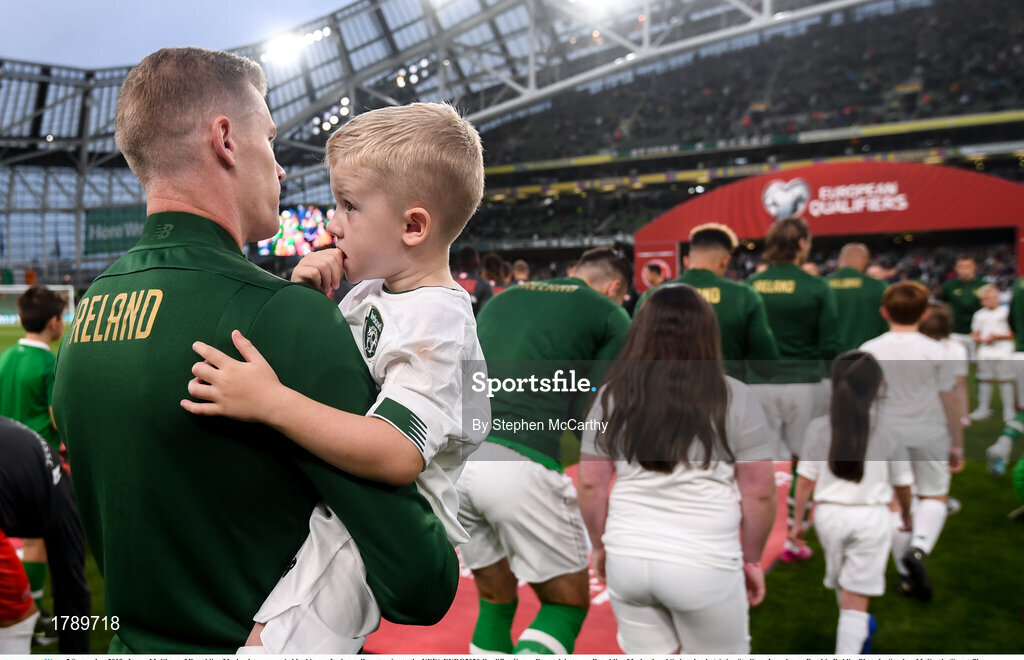 5 September 2019; James McClean of Republic of Ireland accompanied by his son Junior walks out prior to the UEFA EURO2020 Qualifier Group D match between Republic of Ireland and Switzerland at Aviva Stadium, Lansdowne Road in Dublin. Photo by Stephen McCarthy/Sportsfile