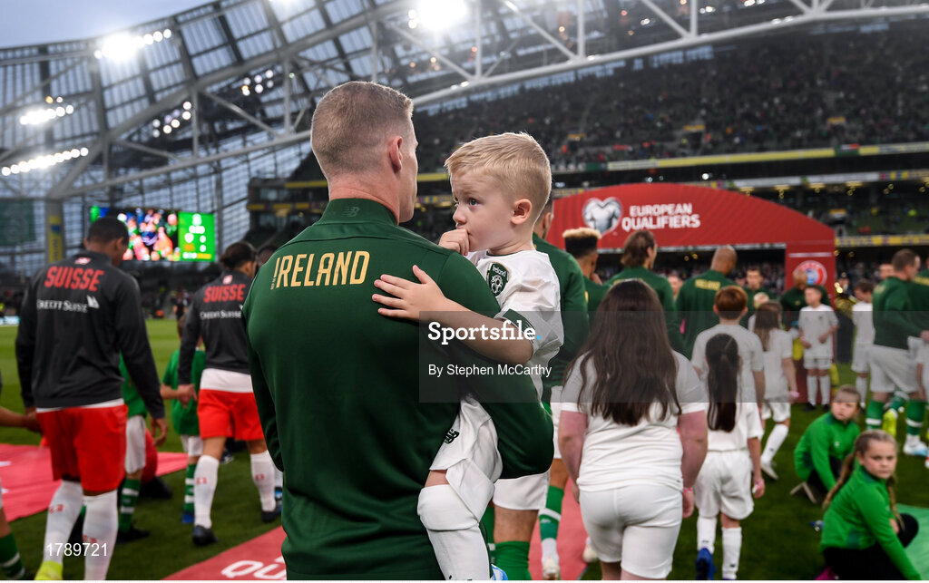 5 September 2019; James McClean of Republic of Ireland accompanied by his son Junior walks out prior to the UEFA EURO2020 Qualifier Group D match between Republic of Ireland and Switzerland at Aviva Stadium, Lansdowne Road in Dublin. Photo by Stephen McCarthy/Sportsfile