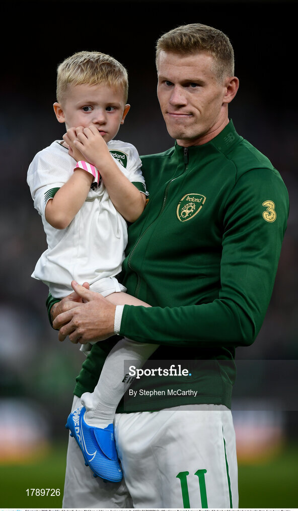 5 September 2019; Republic of Ireland's James McClean and his son Junior prior to the UEFA EURO2020 Qualifier Group D match between Republic of Ireland and Switzerland at Aviva Stadium, Lansdowne Road in Dublin. Photo by Stephen McCarthy/Sportsfile