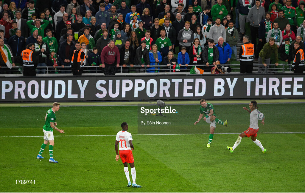 5 September 2019; Scott Hogan of Republic of Ireland in action against Kevin Mbabu of Switzerland during the UEFA EURO2020 Qualifier Group D match between Republic of Ireland and Switzerland at Aviva Stadium, Lansdowne Road in Dublin. Photo by Eóin Noonan/Sportsfile