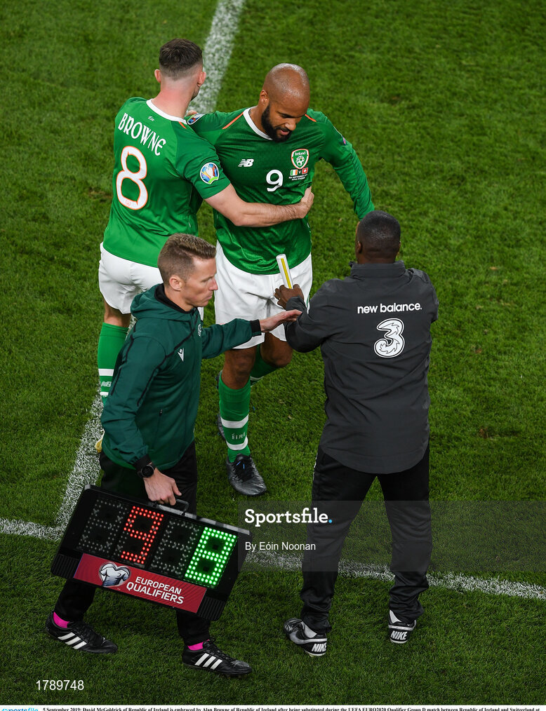 5 September 2019; David McGoldrick of Republic of Ireland is embraced by Alan Browne of Republic of Ireland after being substituted during the UEFA EURO2020 Qualifier Group D match between Republic of Ireland and Switzerland at Aviva Stadium, Lansdowne Road in Dublin. Photo by Eóin Noonan/Sportsfile