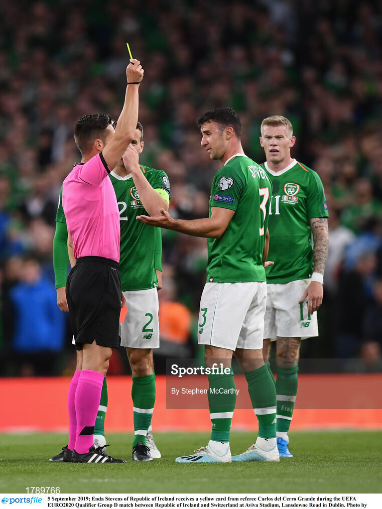 5 September 2019; Enda Stevens of Republic of Ireland receives a yellow card from referee Carlos del Cerro Grande during the UEFA EURO2020 Qualifier Group D match between Republic of Ireland and Switzerland at Aviva Stadium, Lansdowne Road in Dublin. Photo by Stephen McCarthy/Sportsfile