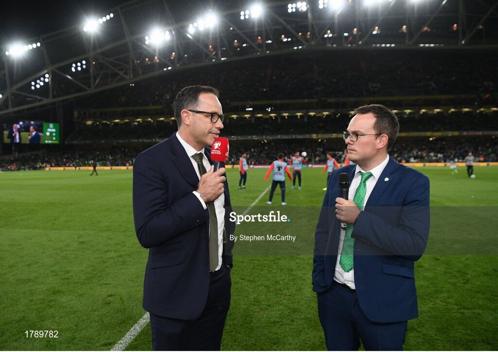 5 September 2019; Former Republic of Ireland goalkeeper David Forde is interviewed by Daniel Kelly of the FAI during the UEFA EURO2020 Qualifier Group D match between Republic of Ireland and Switzerland at Aviva Stadium, Lansdowne Road in Dublin. Photo by Stephen McCarthy/Sportsfile