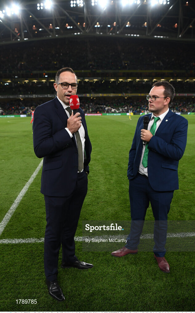 5 September 2019; Former Republic of Ireland goalkeeper David Forde is interviewed by Daniel Kelly of the FAI during the UEFA EURO2020 Qualifier Group D match between Republic of Ireland and Switzerland at Aviva Stadium, Lansdowne Road in Dublin. Photo by Stephen McCarthy/Sportsfile