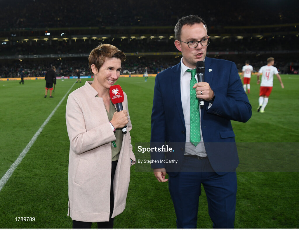 5 September 2019; Referee Michelle O'Neill is interviewed by Daniel Kelly of the FAI during the UEFA EURO2020 Qualifier Group D match between Republic of Ireland and Switzerland at Aviva Stadium, Lansdowne Road in Dublin. Photo by Stephen McCarthy/Sportsfile