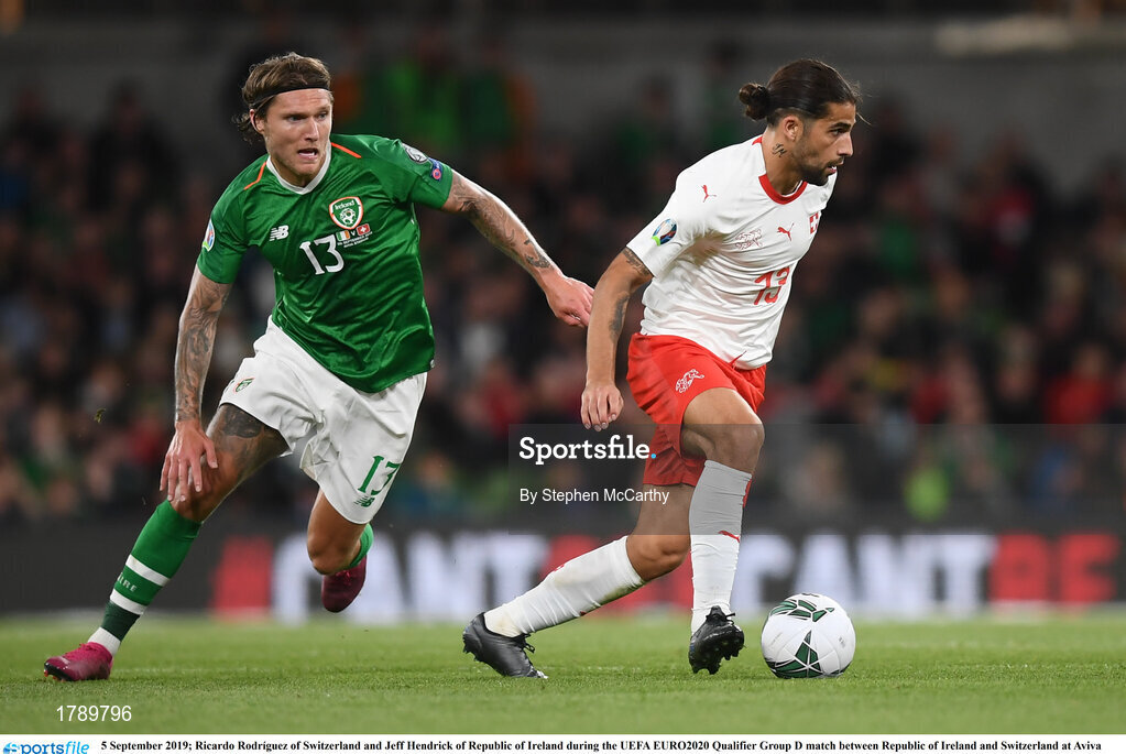 5 September 2019; Ricardo Rodríguez of Switzerland and Jeff Hendrick of Republic of Ireland during the UEFA EURO2020 Qualifier Group D match between Republic of Ireland and Switzerland at Aviva Stadium, Lansdowne Road in Dublin. Photo by Stephen McCarthy/Sportsfile