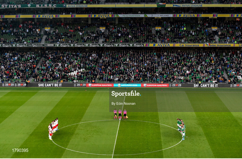 5 September 2019; Both teams stand for a minutes applause prior to the UEFA EURO2020 Qualifier Group D match between Republic of Ireland and Switzerland at Aviva Stadium, Lansdowne Road in Dublin. Photo by Eóin Noonan/Sportsfile
