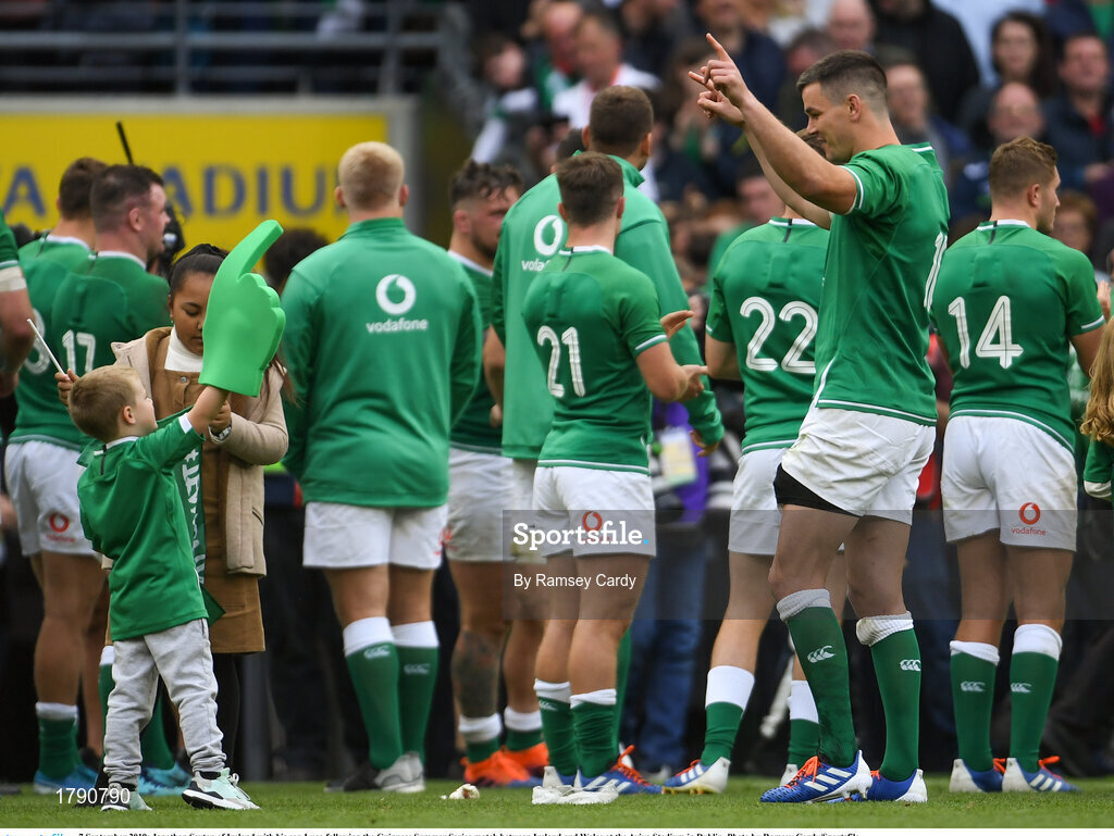 7 September 2019; Jonathan Sexton of Ireland with his son Luca following the Guinness Summer Series match between Ireland and Wales at the Aviva Stadium in Dublin. Photo by Ramsey Cardy/Sportsfile
