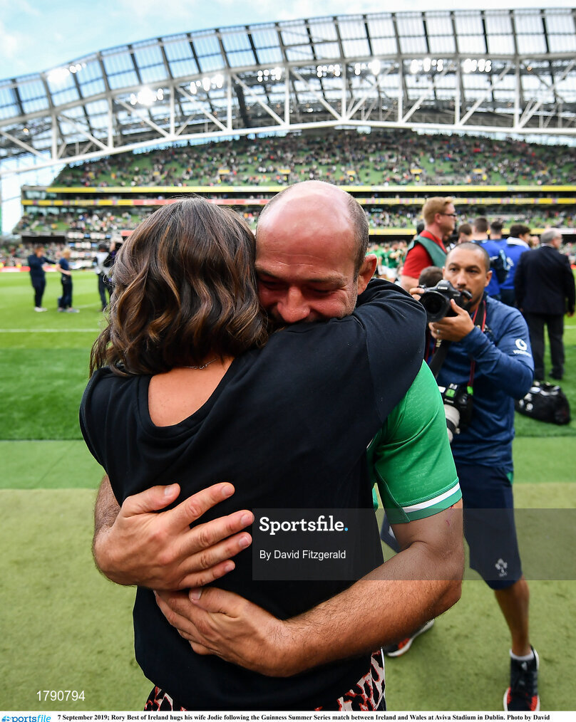 7 September 2019; Rory Best of Ireland hugs his wife Jodie following the Guinness Summer Series match between Ireland and Wales at Aviva Stadium in Dublin. Photo by David Fitzgerald/Sportsfile