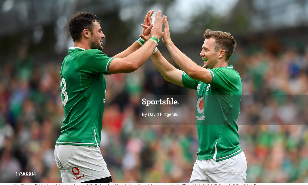 7 September 2019; Jack Carty of Ireland, right, and team-mate Robbie Henshaw embrace following the Guinness Summer Series match between Ireland and Wales at Aviva Stadium in Dublin. Photo by David Fitzgerald/Sportsfile