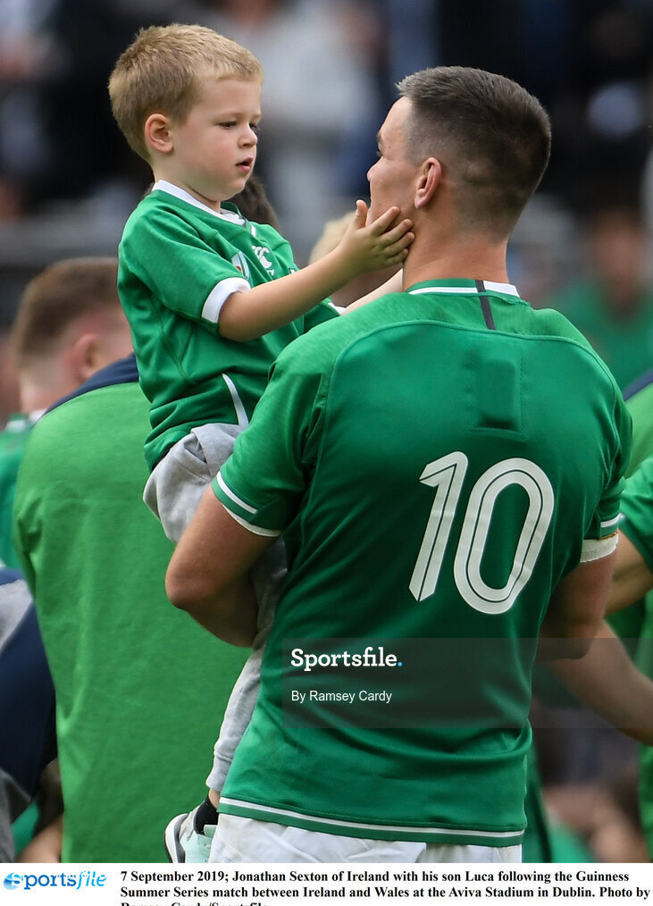 7 September 2019; Jonathan Sexton of Ireland with his son Luca following the Guinness Summer Series match between Ireland and Wales at the Aviva Stadium in Dublin. Photo by Ramsey Cardy/Sportsfile