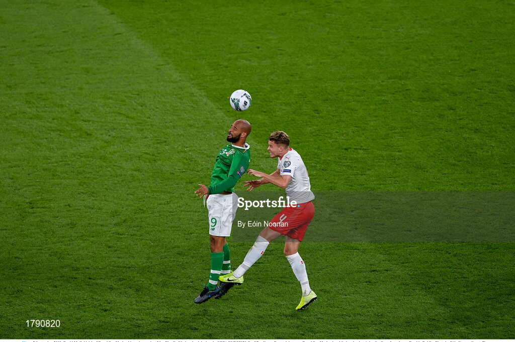 5 September 2019; David McGoldrick of Republic of Ireland in action against Nico Elvedi of Switzerland during the UEFA EURO2020 Qualifier Group D match between Republic of Ireland and Switzerland at Aviva Stadium, Lansdowne Road in Dublin. Photo by Eóin Noonan/Sportsfile