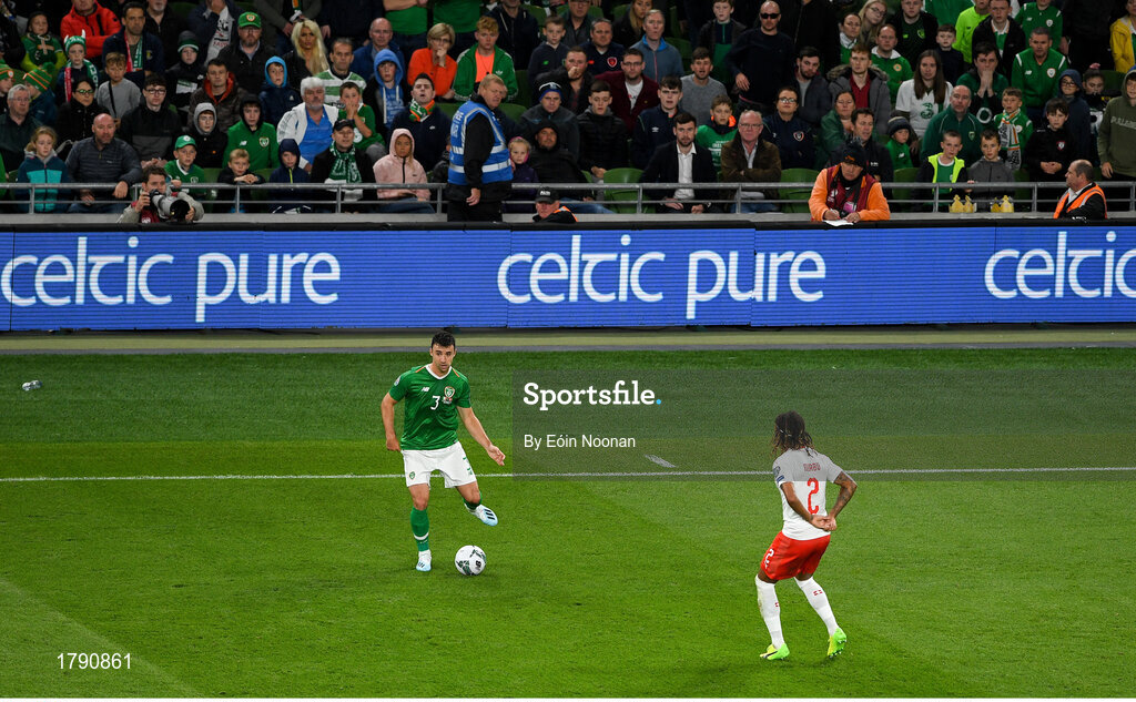 5 September 2019; Enda Stevens of Republic of Ireland in action against Jacques-François Moubanje of Switzerland during the UEFA EURO2020 Qualifier Group D match between Republic of Ireland and Switzerland at Aviva Stadium, Lansdowne Road in Dublin. Photo by Eóin Noonan/Sportsfile
