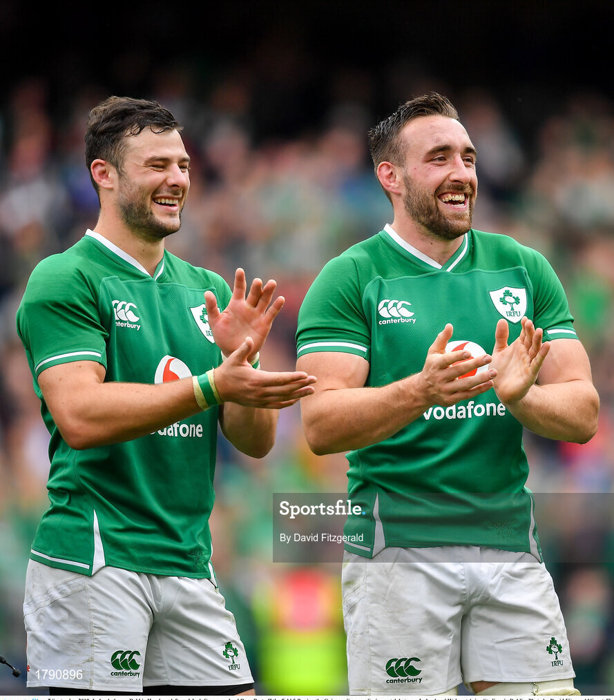 7 September 2019; Ireland players Robbie Henshaw, left, and Jack Conan applaud Rory Best off the field following the Guinness Summer Series match between Ireland and Wales at Aviva Stadium in Dublin. Photo by David Fitzgerald/Sportsfile
