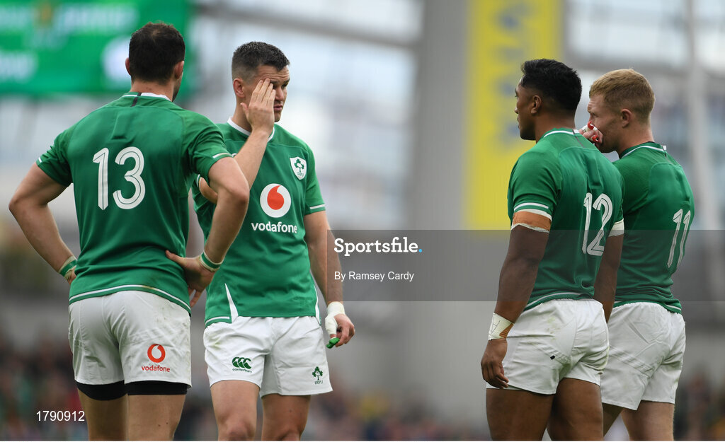 7 September 2019; Ireland players, from left, Robbie Henshaw, Jonathan Sexton, Bundee Aki and Keith Earls during the Guinness Summer Series match between Ireland and Wales at the Aviva Stadium in Dublin. Photo by Ramsey Cardy/Sportsfile