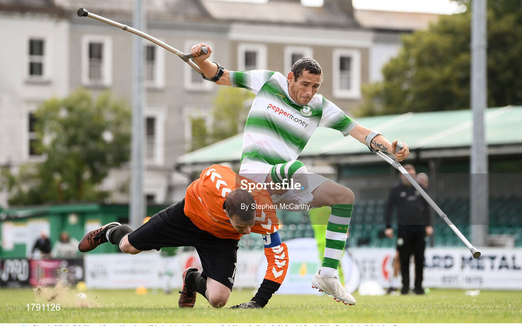 7 September 2019; Alan Wall of Shamrock Rovers and James Conroy of Bohemians during the Megazyme Amputee Football League Cup Finals at Carlisle Grounds in Bray, Co Wicklow. Photo by Stephen McCarthy/Sportsfile