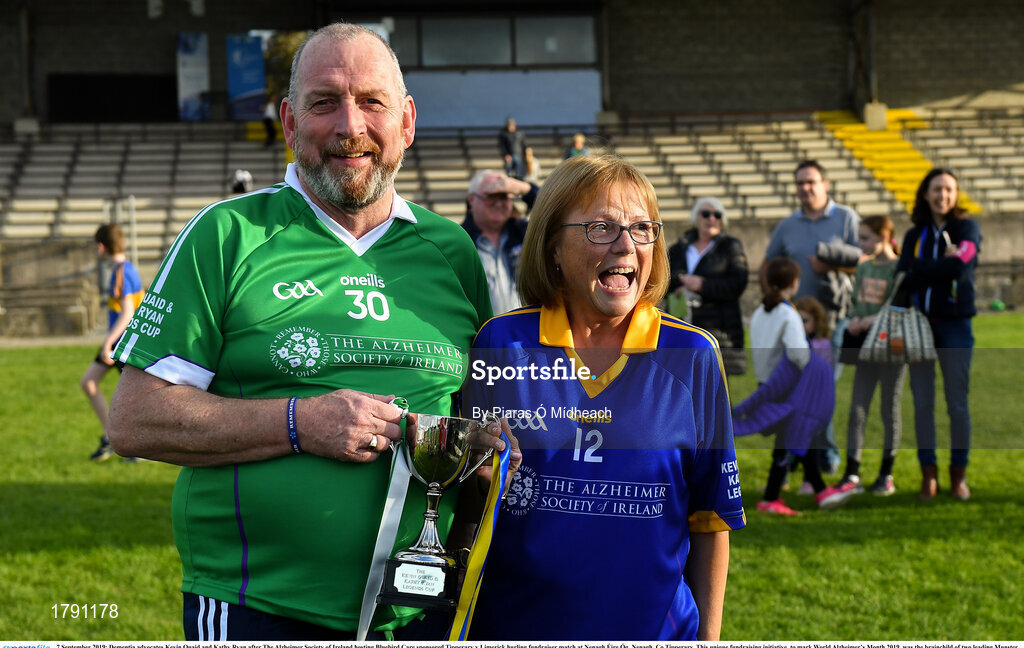 7 September 2019; Dementia advocates Kevin Quaid and Kathy Ryan after The Alzheimer Society of Ireland hosting Bluebird Care sponsored Tipperary v Limerick hurling fundraiser match at Nenagh Éire Óg, Nenagh, Co Tipperary. This unique fundraising initiative, to mark World Alzheimer’s Month 2019, was the brainchild of two leading Munster dementia advocates, Kevin Quaid and Kathy Ryan, who both have a dementia diagnosis. All the money raised will go towards providing community services and advocacy supports in the Munster area and beyond. Photo by Piaras Ó Mídheach/Sportsfile