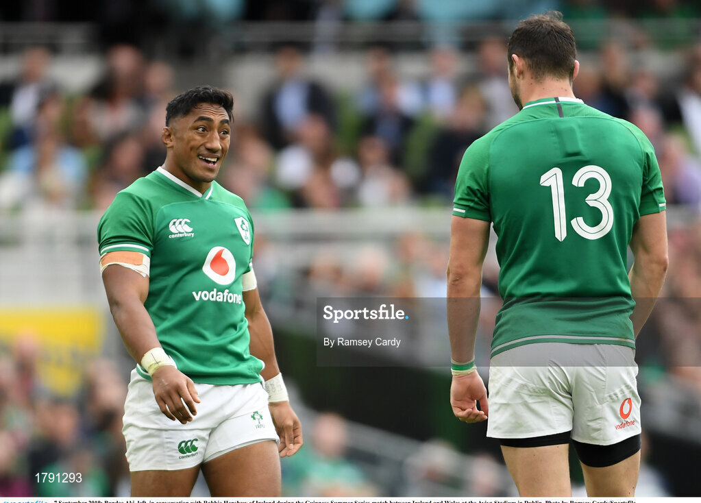 7 September 2019; Bundee Aki, left, in conversation with Robbie Henshaw of Ireland during the Guinness Summer Series match between Ireland and Wales at the Aviva Stadium in Dublin. Photo by Ramsey Cardy/Sportsfile