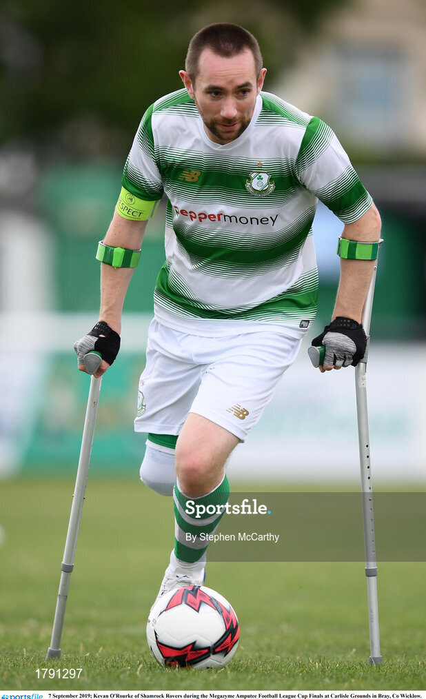 7 September 2019; Kevan O'Rourke of Shamrock Rovers during the Megazyme Amputee Football League Cup Finals at Carlisle Grounds in Bray, Co Wicklow. Photo by Stephen McCarthy/Sportsfile