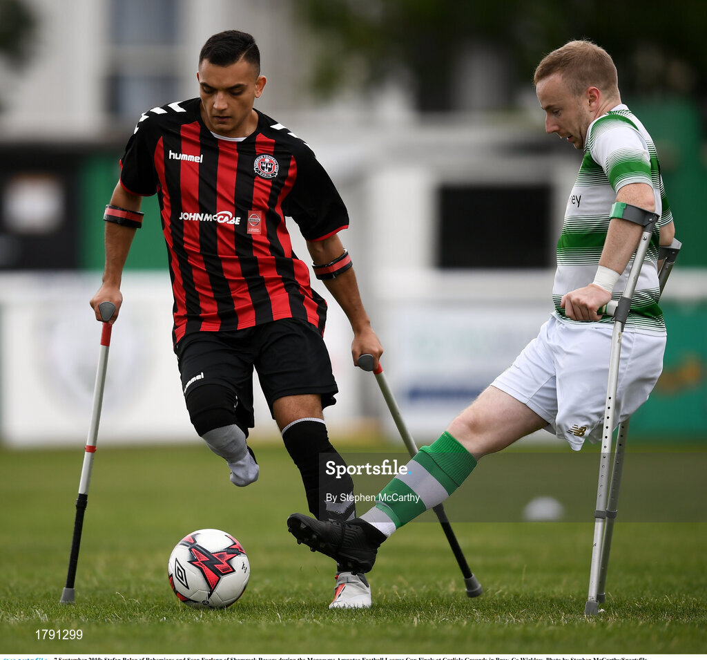 7 September 2019; Stefan Balog of Bohemians and Sean Furlong of Shamrock Rovers during the Megazyme Amputee Football League Cup Finals at Carlisle Grounds in Bray, Co Wicklow. Photo by Stephen McCarthy/Sportsfile